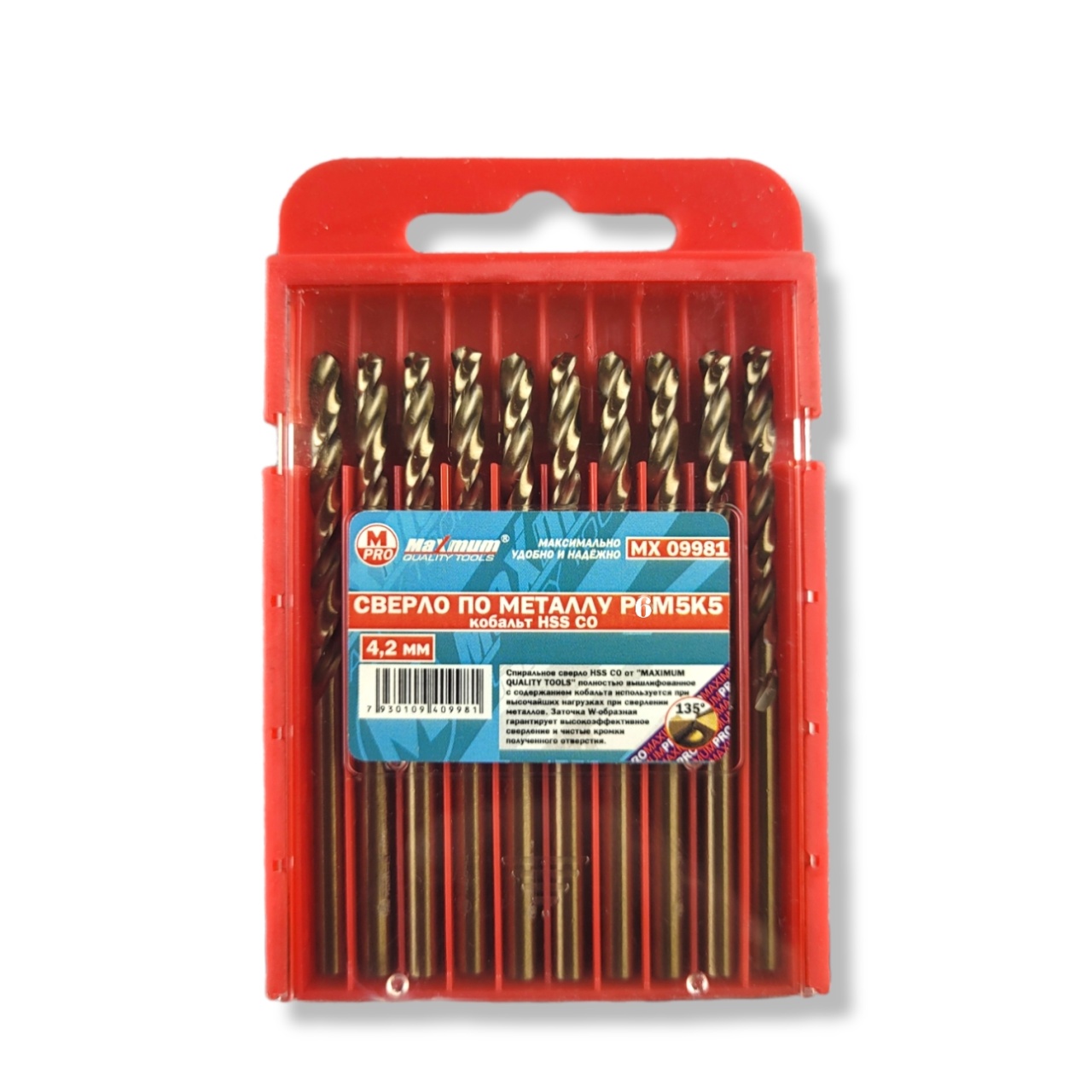 Профессиональные кобальтовые сверла 4,2 мм HSS для работ по металлу из стали P6M5K5 от бренда "MAXIMUM QUALITY TOOLS" имеют цилиндрический хвостовик для дрели и шуруповерта. Общая длина: 73 мм. Рабочая часть 45 мм. Сверло HSS СО 4,2 мм имеет удобную маркировку фактического диаметра. Предназначено для получения отверстий различного диаметра в листовых материалах без перестановки режущего инструмента. Сверло изготовлено из быстрорежущей стали, благодаря чему служит длительное время и работает с высокой скоростью.